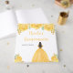 This Quinceanera guest book features faux glitter gold floral flowers and a beautiful princess with brown hair and an elegant dress. This is perfect for a Quinceanera birthday party.