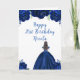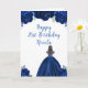 This birthday card features faux glitter navy blue floral flowers and a beautiful princess with brown hair and an elegant dress. This is perfect for a birthday party.
