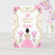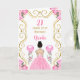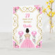 This birthday card invitation features an elegant gold frame, a beautiful princess with brown hair and a pink dress, flowers and a balloon.
