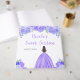 This sweet sixteen guest book features faux glitter purple floral flowers and a beautiful princess with brown hair and an elegant dress. This is perfect for a sweet sixteen birthday party.