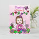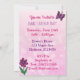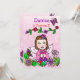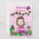 Pretty whimsical fairy tale style brown haired and green eyed Caucasian or Asian girl fairy Birthday invitations with folk art style hand sketched fairies, flowers and butterflies. Purple, pink, red, lime green and all kinds of pretty bright colours!