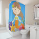 Pretty and cute shower curtain for girls who love the ocean and mermaids, features a cute brown haired mermaid, coral, seaweed, seashells, and a starfish on a bright blue background.