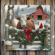 Christmas puzzle. Pretty watercolor style ai illustration of a brown horse, spotted cow on a farm on a snowy winter day with a cardinal on the rustic fence and a red barn in the background.