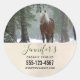 Business stickers with a photograph of a brown horse with a long white scruffy mane. Standing in a forest with snowflakes falling all around.