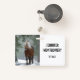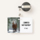 Name badge with a photograph of a brown horse with a long white scruffy mane. Standing in a forest with snowflakes falling all around.