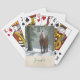 Playing cards with a photograph of a brown horse with a long white scruffy mane. Standing in a forest with snowflakes falling all around.