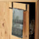 Kitchen towel with a photograph of a brown horse with a long white scruffy mane. Standing in a forest with snowflakes falling all around.