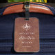 Stand out in a crowd with our stylish adventure themed personalised luggage tags. Design features a white compass with quote "And so the adventure begins" on a brown leather look print background. Personalise with your name.