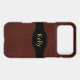 Red-brown leather texture is the background on this iPhone case. A black band and badge holds your name or monogram. Elegant, country, and very stylish!