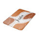 Personalized orange brown bath mat with a modern abstract geometrical shapes pattern and a personalized name print in the center. Matching shower curtain available.