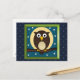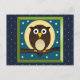 Brown night owl sitting on a branch. Behind him is a big yellow moon and a starry night. Framed in a green frame.