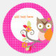 Lovely little brown owl with colourful feather of mandarin orange and hot pink. She has a little daisy pinned on her head and sitting on a branch of gorgeous floral. Customisable background colour... see here to pick your new background colour >>>