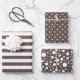 Three patterns in coffee brown and white: basic stripes, polka dots and random spots.