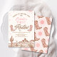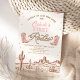 Pink and brown girl's vintage style first rodeo birthday invitation with a desert landscape with cactus, cowgirl boots, pink sun and a rope like text heading. This girl's first rodeo birthday invitation is ideal for a wild west themed first birthday party but can be used for any age as all text is editable.
