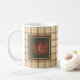 Welcome fall with this custom plaid pattern kitchen coffee mug. Coffee mug features beautiful autumn colours -- tan, brown, green, burnt orange, and yellow. A traditional maple leaf and your family monogram initial completes the look.