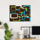 A colourful design of lime green, white and turquoise blue retro inspired squares against a chocolate brown background on a poster
