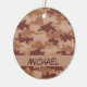 Enjoy this stylish ornament personalised with your name and a camouflage design. This camouflage is original art in shades of warm brown and tan. A light tab strip provides an area to personalise with your name, monogram initials or other words of your choice such as business name or saying. This stylish and trendy camo design is by artist and fabric designer Phyllis Dobbs and is available in pink, red, blue, orange, grey, lime green, olive green and turquoise blue camo on various products for your enjoyment or for great gifts. Have fun with camouflage! Fully customisable for personalisation.