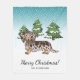Destei's original cartoon illustration of an adorable long hair chocolate brown and tan dapple coat colour Dachshund breed dog. The dog is placed in a winter scene with three green fir trees and falling snow. The background is a blue to white gradient giving the design that cold winter day look. There is also a personalizable text area that now reads "Merry Christmas!" in a beautiful script font. Under it is another personalizable text area for a family name or other custom text.