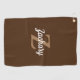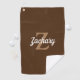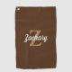 This personalised golf towel features a tan monogram initial and white retro script name on a brown background.