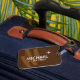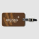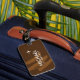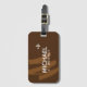 A cool and modern luggage tag personalised with the name and initial of the traveller on a brown background