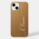 Brown Shimmer White Elegant Calligraphy Script Custom Personalised Name iPhone 14 Smart Phone Cases features a modern and trendy simple and stylish design with your personalised name in elegant hand written calligraphy script typography on a metallic brown shimmer background. Designed by ©Evco Studio www.zazzle.com/store/evcostudio