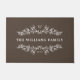 Brown door mat with your name framed by mirrored half-wreaths of leaves and berries. Add your initial and the year your family was established in an elegant white font.