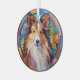 This is a pretty glass ornament with a stained glass theme, featuring a beautiful brown and white Shetland Sheepdog. The dog is set against a predominantly blue and gold background. This makes a nice stocking stuffer or decoration for the household who loves a Sheltie.