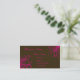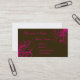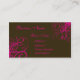 This elegant business card is done on a chocolate brown background. There are vibrant pink swirls in the lower left corner and the upper right. Add your business name, your name, address and contact information. Customise in your choice of fonts and colours