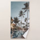 Brown wooden lounge chairs near pool surrounded by bath towel