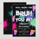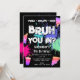 A teen boys "Bruh" themed birthday invitation using cool typography. A custom kids neon graffiti blue, green, pink and purple "pizza, arcade and cake " teenage boys birthday invitation design perfect for any teens birthday party theme. Customize this "Bruh" birthday invitation with your own text and make it your own!
