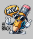 A cheerful, sunglass-wearing pencil gives thumbs up next to a "BRUH WE BACK" speech bubble and text on this casual graphic design.