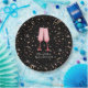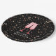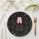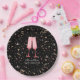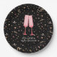 Two pink glass flutes on a black background with pink and gold confetti, these paper plates are perfect for a bridal shower brunch and bubbly theme. MATCHING items in our collection.