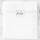 The sticker is made on wonderful paper and had no problem sticking to the bag that I purchased to put it on. I wanted to find a design that would be cute for the bride and groom and this one fit the bill as it has cute "bees" buzzing around and the wedding was taking place in a town called "Bee Cave". The packaging was great and protected the stickers. The website is easy to navigate and there are so many color choices. I had no problem finding a color that the bride was using on everything else selected. The design was adorable and there were many to choose from. You can make the figure as larger or smaller and you can place the photo and writting whereever you want to in the sticker. The printing is fabulous..better than expected.