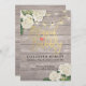 Bridal Shower / Wedding Celebration Invitation Card Templates - Elegant White lovely Watercolor Hydrangea Flowers and String Lights on Rustic Wood Background.
