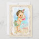 Elegant light brunette beach baby with conch shell double sided baby shower invitations with a cute vintage baby on the beach in a hibiscus bikini holding a conch shell. The border of this chic invite has a pretty sand, pearls and seashells frame. Text, font and colour of font can all be customised. If you need assistance customising your product please contact me through my store. I will be happy to help. PLEASE NOTE: These are flat printed graphics - no raised parts.