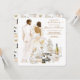 Bridal shower invitations features brunette, dark skin bride and groom to be in gold glitter with bridal registry gifts and wedding motiff.