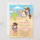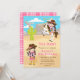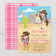 This cute and fun invitation features a cowgirl with brunette hair and fair skin. In one pose she is riding a horse and throwing a lasso and in the other she has a coil of rope and is waving. In the background is a western scene with sand, mountains and a cactus. The text combines decorative and sans serif fonts for a stylish and modern look. This is perfect for a cowgirl or western themed birthday party.