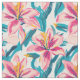 Big, bold petals in radiant shades of pink, magenta, and sunshine yellow bloom alongside graceful lilies, all rendered in a painterly, hand-brushed style. Expressive teal leaves sweep outward with fluid motion, adding contrast and depth against a crisp white background. The composition feels alive with movement and joy, balancing the drama of oversized blossoms with the elegance of lilies. Printed on high-quality fabric, this design offers both beauty and versatility—perfect for upholstery, drapery, statement cushions, or fashion pieces that call for vibrant energy. Durable yet soft to the touch, the fabric showcases the richness of colour and the artistry of brushwork, making it an ideal choice for modern interiors or bold, creative projects.