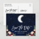 Modern Brush Script, Celestial Wedding Save The Date engagement announcement postcard. Watercolor blue night sky with stars and the moon. Watercolor Burgundy Marsala Blue Pink Floral. Greenery Eucalyptus Leaves.