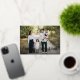 Festive Hanukkah holiday photo card features your favourite horizontal or landscape orientated photo in full bleed, with "Happy Hanukkah" overlaid in gold foil hand lettered brush typography. Personalise the front of the card with your names and the year.