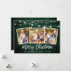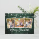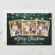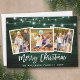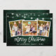 Rustic Green Wood Brush Script 3 Photo Family Merry Christmas Card with String Lights