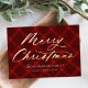 Elegant holiday card featuring "Merry Christmas" displayed in a gold foil calligraphy script on a painted red plaid background. Personalise the front of the rustic non-photo holiday card by adding your name and the year. The back of the card features a matching plaid background with subtle white snow dots.