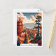 Experience the surreal beauty of Bryce Canyon National Park in Utah with this vintage postcard featuring its famous red rock hoodoos and dramatic amphitheaters. Bryce Canyon is known for its striking geological formations and breathtaking sunrise views over the colourful landscape. This retro-style postcard captures the awe-inspiring scenery of the park, inviting you to explore its unique rock formations, scenic trails, and panoramic overlooks