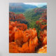 Bryce canyon Utah posters FROM 8.99 . Bryce canyon is not a canyon but a giant natural amphitheater created by erosion along the eastern side of the Paunsaugunt Plateau. Words confound when no comparable exist. A cave without a ceiling? A forest of stone? Even 'canyon' is misleading since Bryce is carved by freeze-thaw cycles, not a river. Yet, 'world's largest pothole' is neither adequate nor flattering. Bryce is distinctive due to geological structures called hoodoos, formed by wind, water, and ice erosion of the river and lake bed sedimentary rocks. The red, orange, and white colors of the rocks provide spectacular views for park visitors. Bryce sits at a much higher elevation than nearby Zion National Park. Spectacular at any time of year this wonder of the world will add majesty and depth to any room