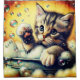 Dive into the playful charm of this delightful artwork featuring a kitten enjoying a bubble bath. The kitten, with a sleepy expression, playfully reaches out with one paw amidst numerous bubbles. The warm orange to yellow gradient background adds a cosy and inviting feel to the scene. This whimsical design captures the fun and relaxation of bath time, making it perfect for adding a touch of cuteness and warmth to any space.