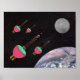 A holiday space fantasy with bubble light space ships orbiting the Earth with the moon in the distance and a starry sky background. It looks almost like a classic Si-Fi theme or space alien invasion with the bubble lights as an armada of spacecraft. However it’s simply a science fiction art illusion as a work of art.