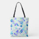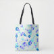 This tote bag presents an abstract display of bubbles against a white canvas with a neon-cyan square line overlay, creating an engaging visual.