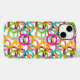 This phone case has a geometric design of three circles nested together and spread throughout the design in several colours.