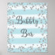 Poster print for Bubbly Bar wedding sign with faux silver glitter design and light blue stripes watercolor background.