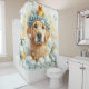 This adorable design features a fluffy dog enjoying a luxurious bubble bath. The dog is adorned with a blue shower cap and a rubber ducky perched on top, surrounded by bubbles and bath accessories like soap, shampoo, and a brush. The playful and whimsical scene is perfect for pet lovers and adds a touch of fun to any bathroom decor.